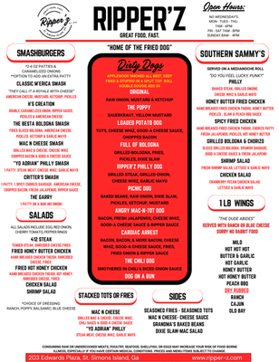 Welcome to Ripper'z! Home of the Fried Dog. Here at Ripper'z we have specialty Hot dogs, Smashburgers, Philly Cheese Sandwiches, Chicken Sandwiches, Wings and much More! Also Open for Breakfast at 7am! Please Join us  for Ribbon Cutting and get a 10% Discount on your Order! RIPPER`Z -