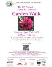 Join us for our 19th Annual Tabby & Tillandsia Garden Walk. Tickets are now on sale, and can be purchased in advanced by using this link: www.cassinagardenclub.org OR through in-person purchase at Ace Garden Center (SSI), Frederica Pharmacy, GJ Ford Bookshop, Maggie's Boutique, and Two Friends.